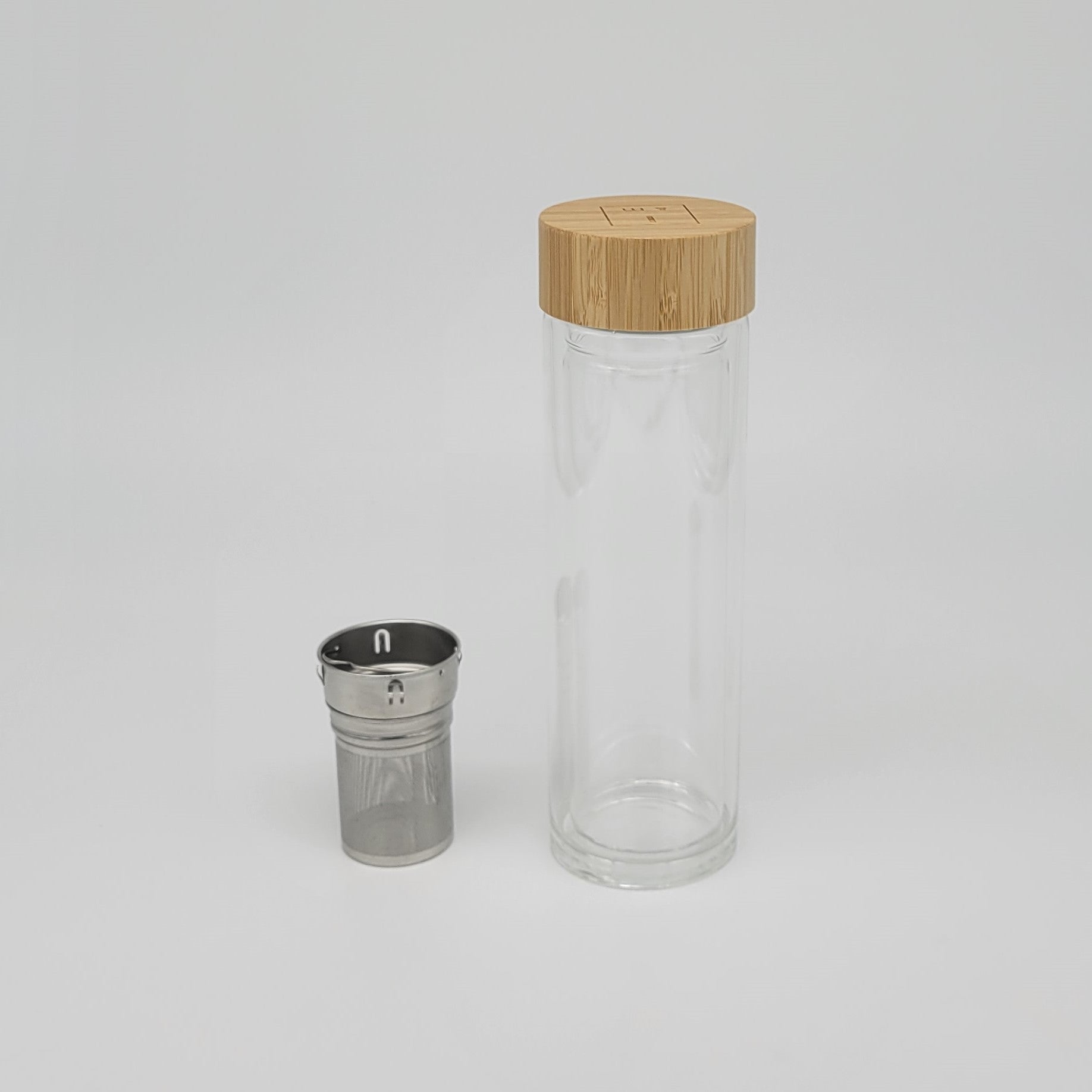 Bamboo and Glass Bottle with Tea Infuser and neoprene sleeve. Travel bottle. Coffee cup, Iced tea tumbler, Hot and cold resistant. I&m